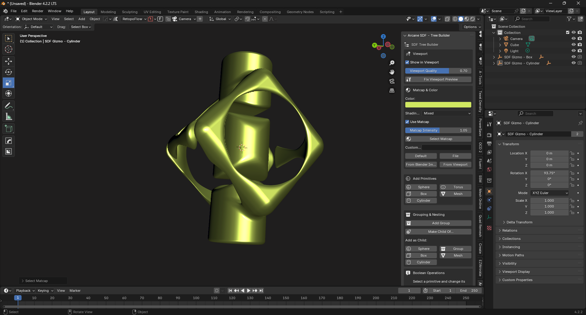 Arcane SDF is a toolkit for building complex 3D forms using signed distance fields (SDF) directly inside Blender. Design with simple primitives and boolean logic, preview instantly in the viewport, and generate clean, watertight meshes using pyOpenVDB for final renders, VFX, and game assets.