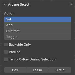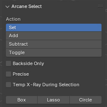 Arcane Select is a Blender add-on that allows you to select vertices, edges, and faces through solid meshes without enabling X-Ray mode. It provides three selection tools: Box, Lasso, and Circle selection with "select-through" functionality.